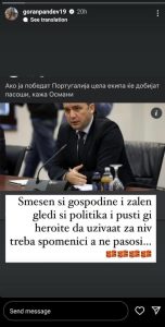 Пандев пораката ја испрати преку објавување „стори“ на Инстаграм со фотографија од Османи и неговото ветување дека ако ја победат Португалија сите фудбалери ќе добијат дипломатски пасош.