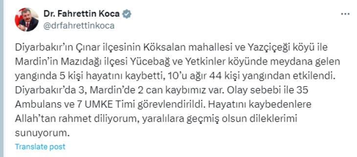 „Пет лица загинаа, а 44 се повредени, од кои 10 потешко“, кога пожар зафати две области во близина на југоисточниот град Мардин, напиша министерот за здравство Фахретин Коџа на X, поранешен Твитер.