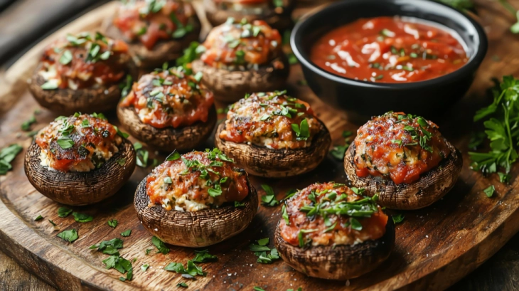 Исчистете ги печурките и одвојте ги капите од стеблата. Ставете ги капите настрана. Исецкајте ги стеблата и пржете ги во малку масло. Оставете да се изладат. Измијте ги доматите и исецкајте ги на коцки. Истурете ги коцките во сад. Потоа исецкајте ја моцарелата на коцки и додадете ја на доматите. Измијте го магдоносот и исецкајте го ситно. Додадете го во доматите и моцарелата. Вклучете ја рерната на 180 степени за малку да се загрее. Подгответе сад за печење или керамички плех за печење. Додадете ги пржените парчиња стебла, сега ладни, во садот со доматите. Потоа зачинете со маслиново масло, балсамико оцет, сол и црн пипер. Нежно измешајте сè со лажица и наполнете ги капите од печурките. Наредете ги во плехот за печење и печете на 180 степени 15 минути.