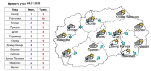 променливо облачно со повремени врнежи од дожд, а на планините од снег. Поради продор на постуден воздух и засилен северен ветер утре врнежите ќе преминуваат во снег на повисоките и во некои од пониските места.