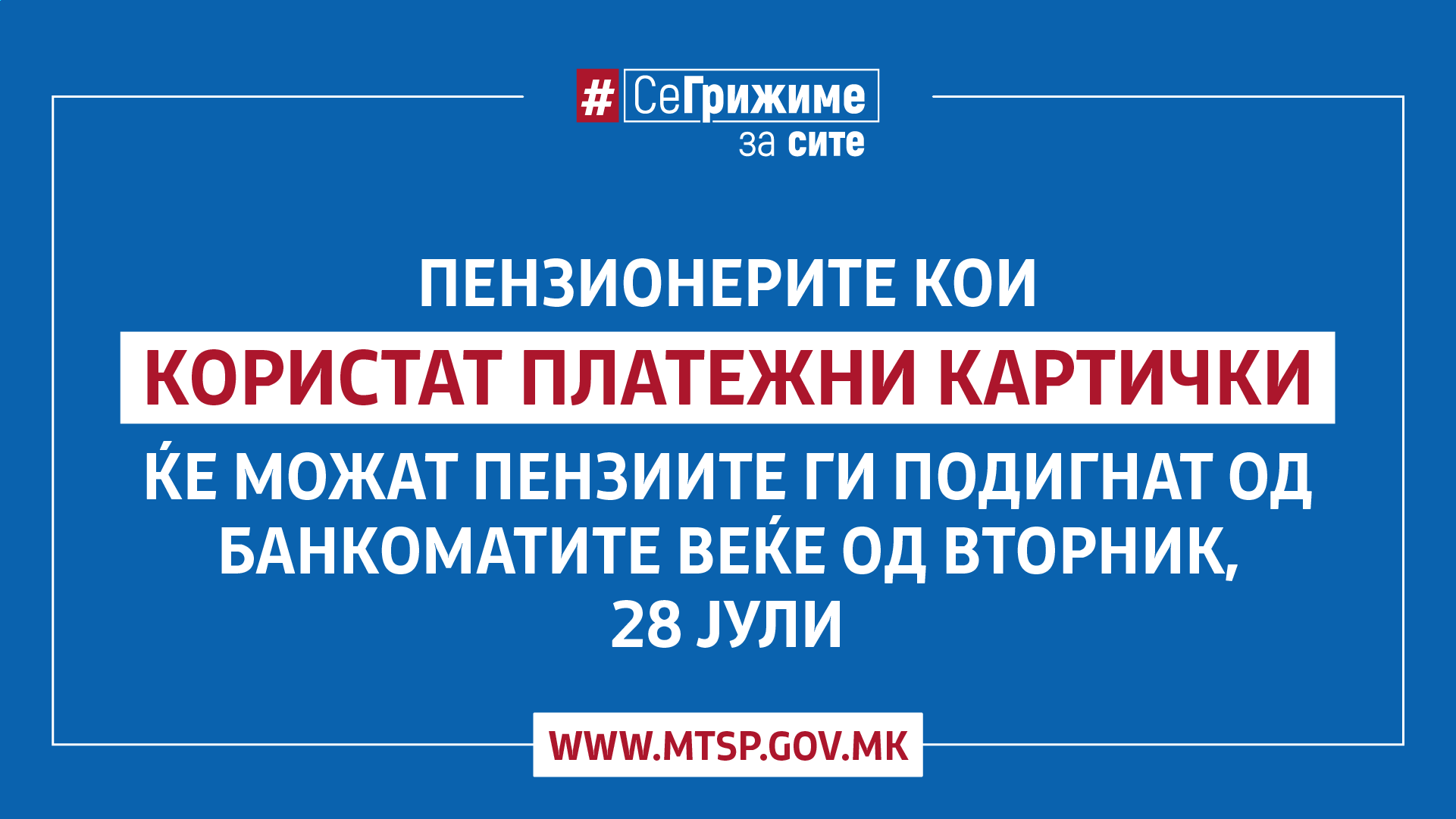 Пензионерите кои користат платежна картичка поврзана со сметката на која се префрлува пензијата, со парите можат да располагаат од вторник 28 јули. Тие можат да ја подигнат јулската пензијата на банкомат, да ги користат средствата за плаќање во трговската мрежа или за електронски плаќања.