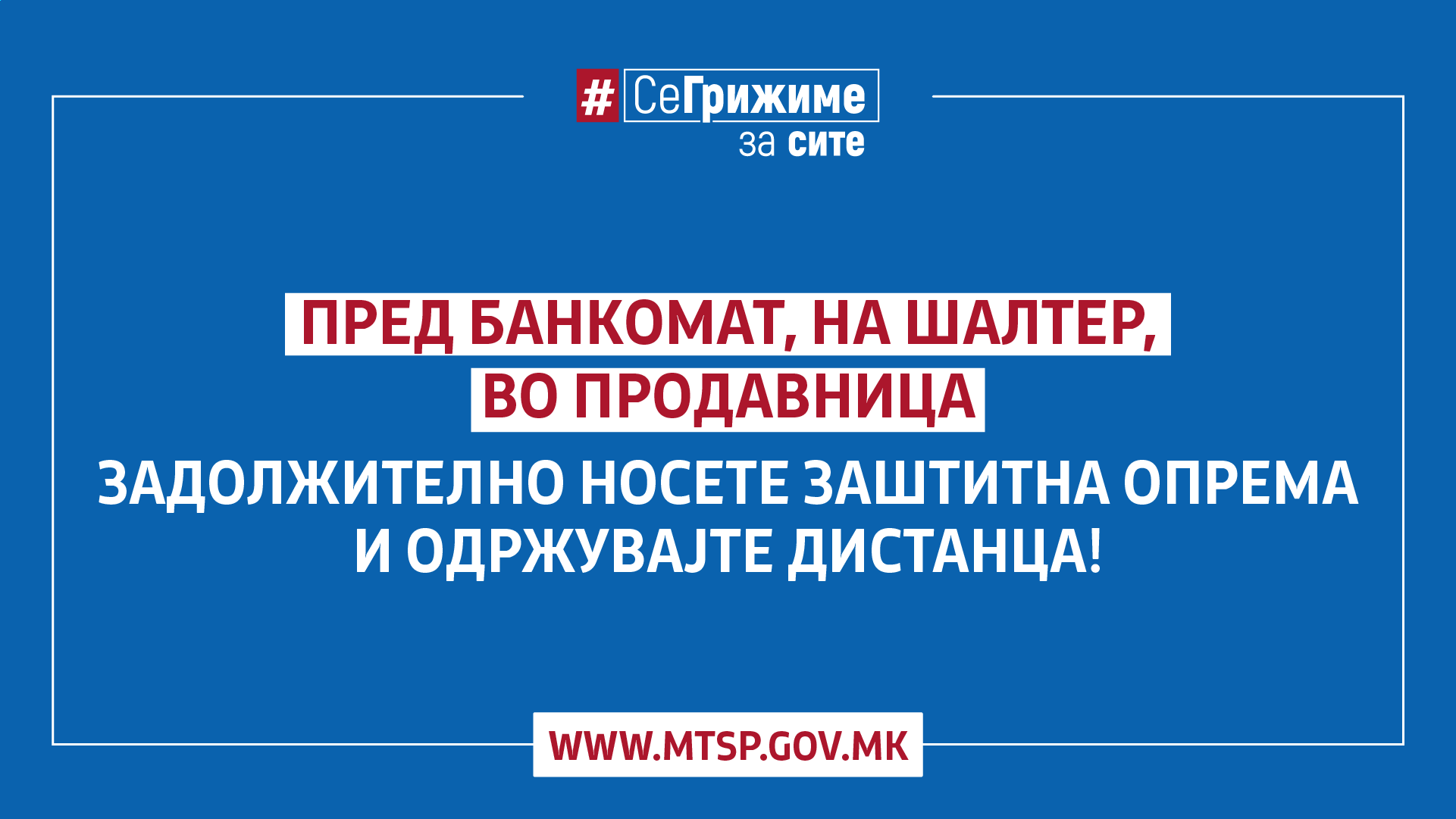 Оттаму потсетуваат на обврската за носење лична заштитна опрема којашто ги покрива пределот на носот и устата како и на држење растојание при чекање ред пред и внатре во банките.