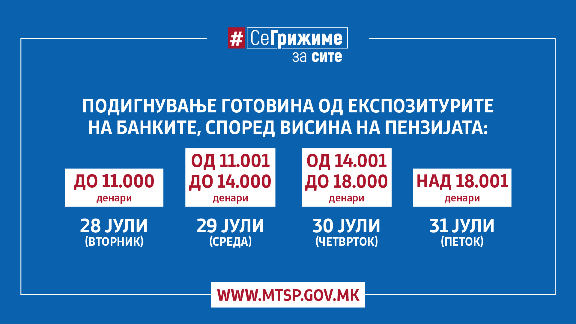 – Исплатата на пензии за јули почнува од утре, информираат од Министерството за труд и социјална политика, од каде додаваат и дека со предвремена и етапна исплата на пензиите, што се реализира последниве четири месеци, се овозможува поголема заштита на пензионерите во услови на опасност од коронавирусот.