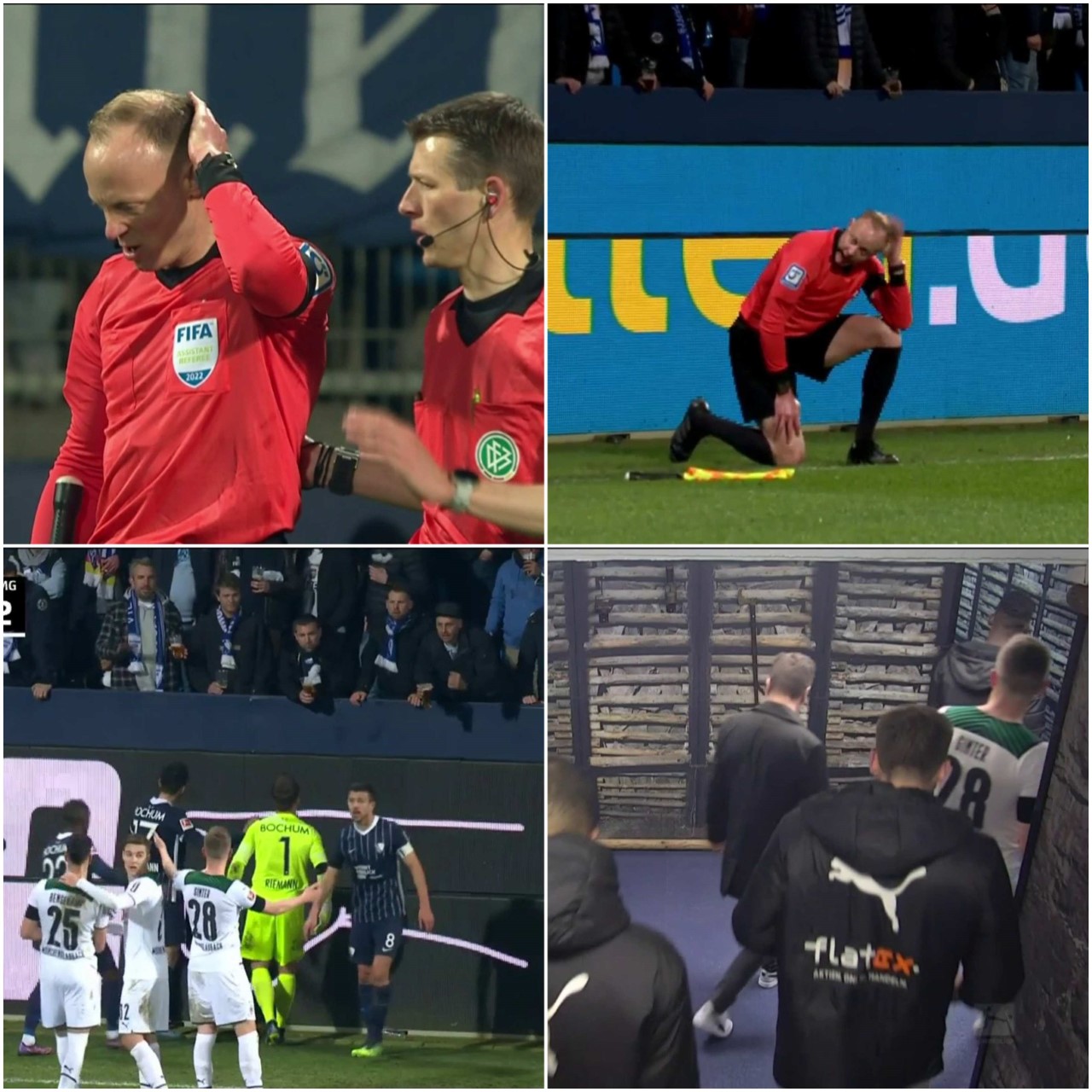 Незадоволни од актуелниот резултат, навивачите на Бохум предизвикаа скандалозни сцени во Бундеслигата, откако линискиот судија Кристијан Гителман беше погоден во пределот на главата со пластична чаша пиво фрлена од трибините. Гителман по кратко време се подигна на нозете по што во консултација со главниот судија натпреварот беше прекинат.