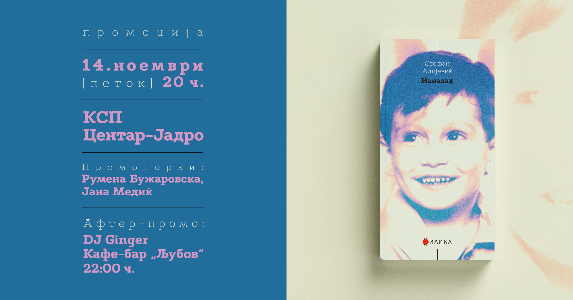 Вo петок ќе се одржи промоцијата на втората збирка раскази на Стефан Алијевиќ, „Наназад“ во издание на издавачката куќа Илика. Настанот ќе започне во 20:00 часот, во КСП Центар-Јадро, а промоторки на книгата ќе бидат Румена Бужаровска и Јана Медиќ. По промоцијата, организаторите покануваат на афтер-промо забава во кафе-бар „Љубов“ со DJ Ginger.