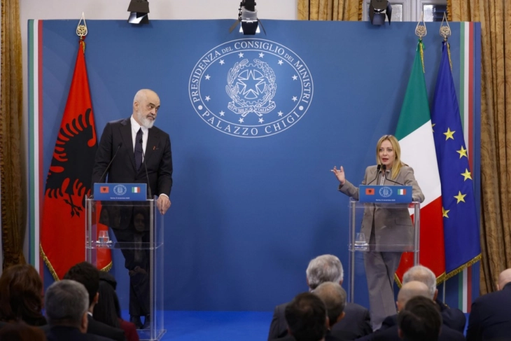 На заедничката прес-конференција во Рим на албанскиот премиер Еди Рама и неговата италијанска колешка, Џорџа Мелони, не изостана прашањето околу камповите за мигрантите во Албанија, кои требаше да бидат транспортирани од Италија.