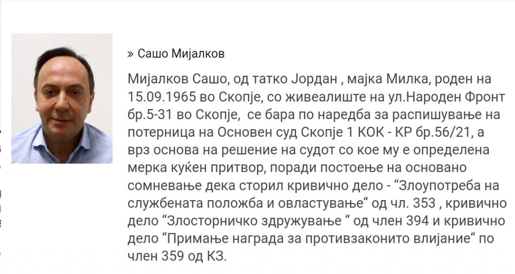По поранешниот директор на УБК, Сашо Мијалков, како обвинет во случајот „Таргет и Тврдина“, ќе се трага и со меѓународна потерница.