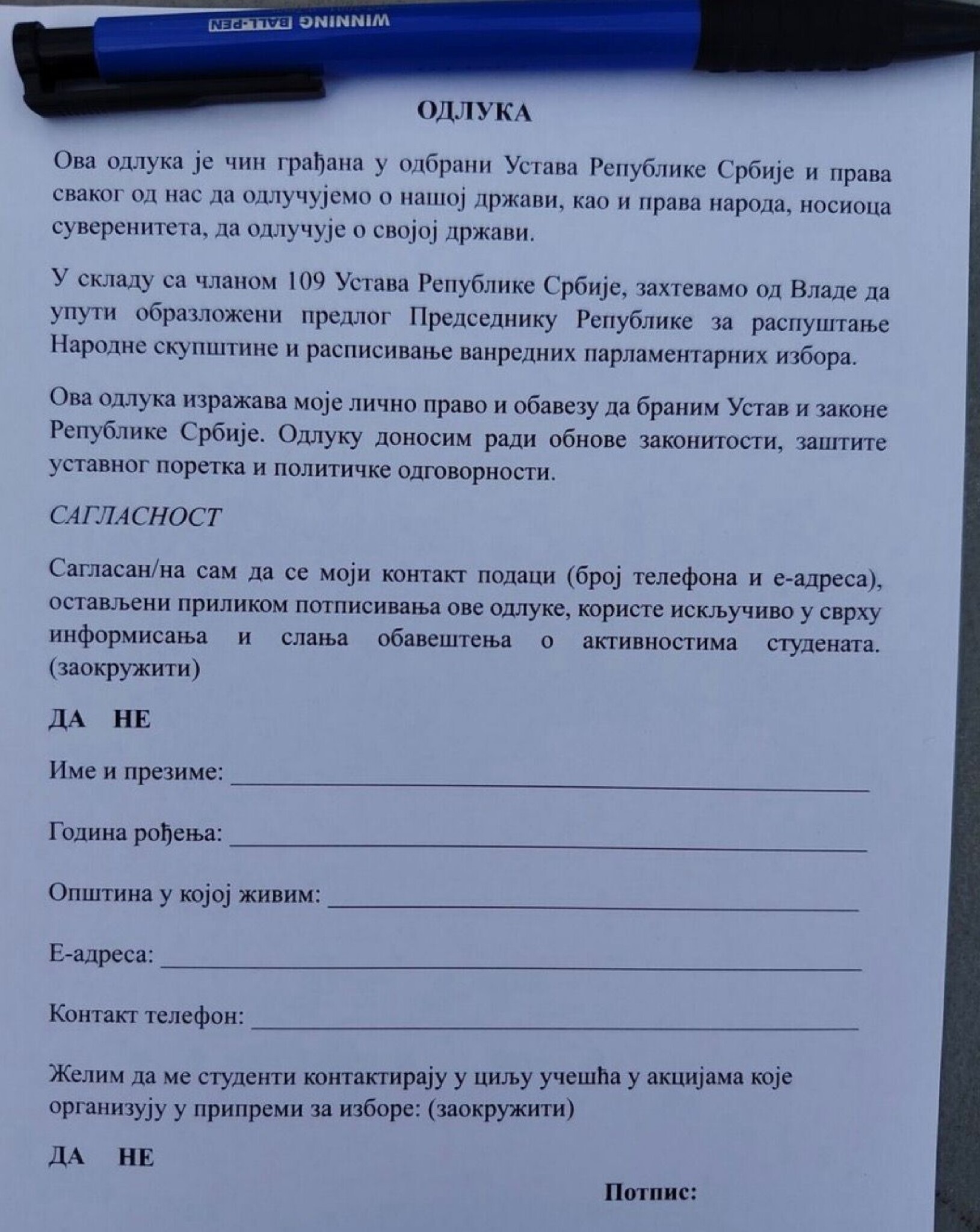 Тие собираат потписи за распишување вонредни парламентарни избори во Србија. Граѓаните можат да ја поддржат иницијативата на речиси 500 штандови, поставени во повеќе од 100 градови и општини.