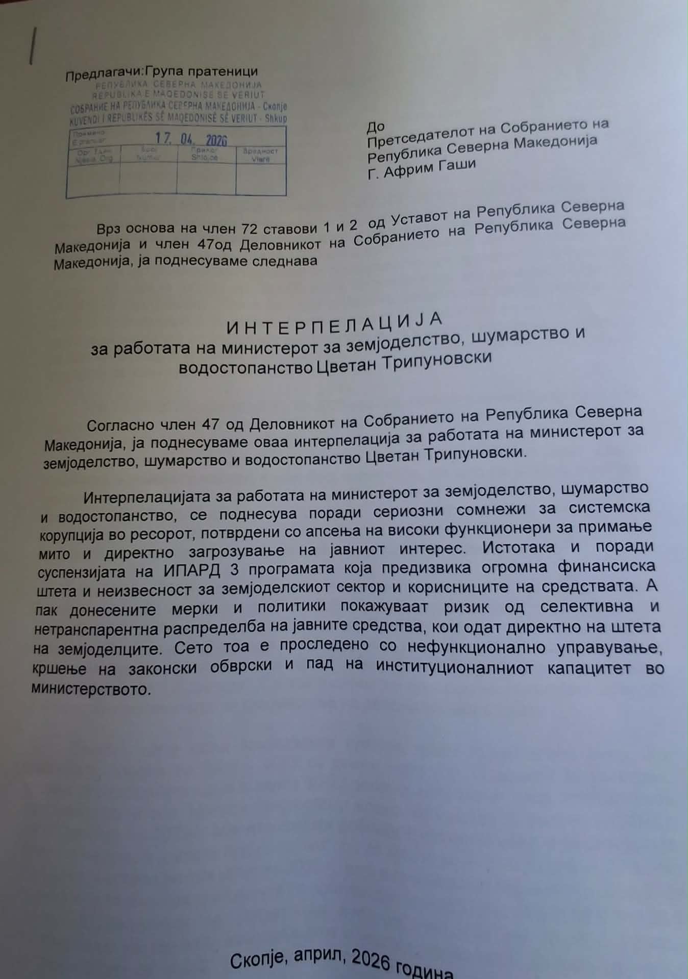 СДСМ поднесе интерпелација за работата на министерот за земјоделство Цветан Трипуновски, обвинувајќи го за, како што велат, корупција, скандали и штетни политики кои го довеле секторот до колапс.