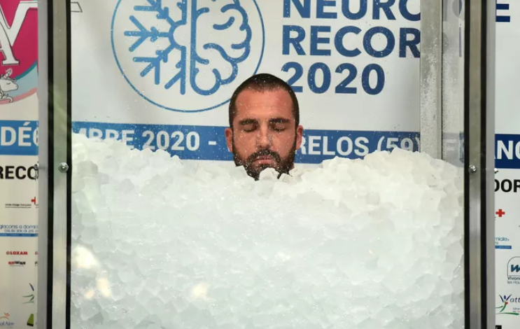 Под контрола на судиите и пред педесетина луѓе кои дојдоа да го поддржат, овој 34-годишен здравствен работник остана потопен 2 часа 35 минути и 43 секунди во кабина од плексиглас исполнета со коцки мраз до вратот, надминувајќи го за 40 минути претходниот светски рекорд.