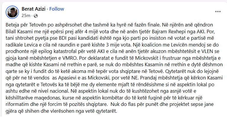 Граѓаните нема да дозволат ниту Апасиев ниту Мицковски да одлучуваат за нас, туку НИЕ самите. Затоа, поддршката што Касами ја бара од граѓаните на Тетово има врска со два многу важни елементи, како на локално, така и на национално ниво. Од локален аспект, таа нема да биде условена од никаков глас на македонските советници, додека во националниот аспект ќе има моќ да побара реформа и зајакнување на албанската позиција. Нема да зборувам за делата и проектите бидејќи тоа се работи што ги гледаат и оценуваат самите граѓани“ напиша Берат Азизи.