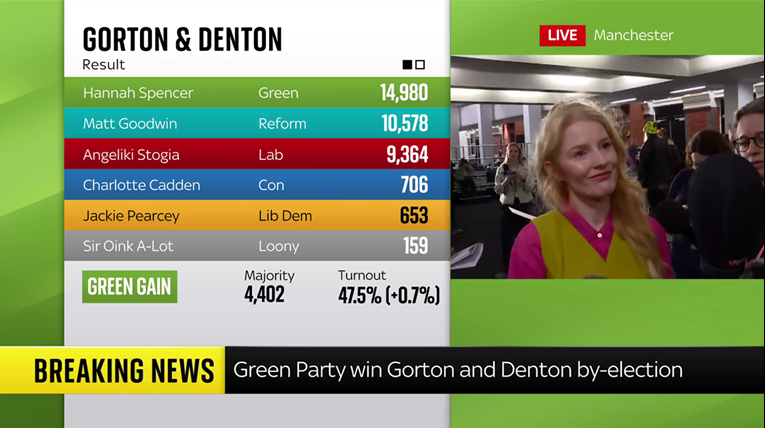 Ова е прв пат Зелената партија, која се залага за излез на Велика Британија од НАТО и легализација на рекреативните дроги, да победи на еден избор за парламентарно место или да освои место на северот од Англија. Ова го зголеми бројот на претставници на Зелената партија во Долниот дом на пет од вкупно 650 места