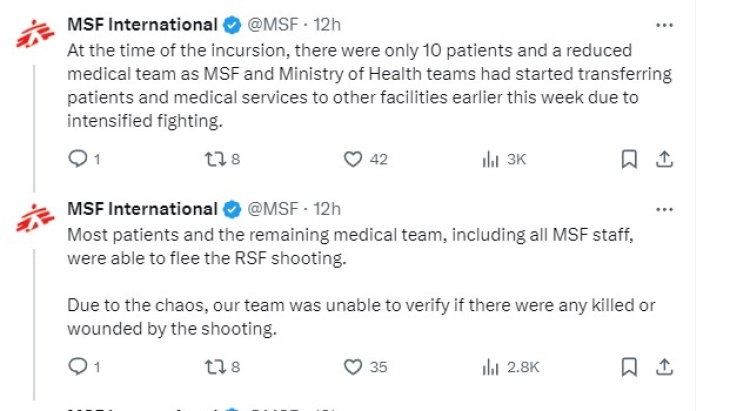 Лекари без граници соопштија дека борците на РСФ вчера ја нападнале Јужната болница во градот Ал-Фашер, главниот град на провинцијата Северен Дарфур, отворајќи оган врз медицинскиот персонал и пациентите.
