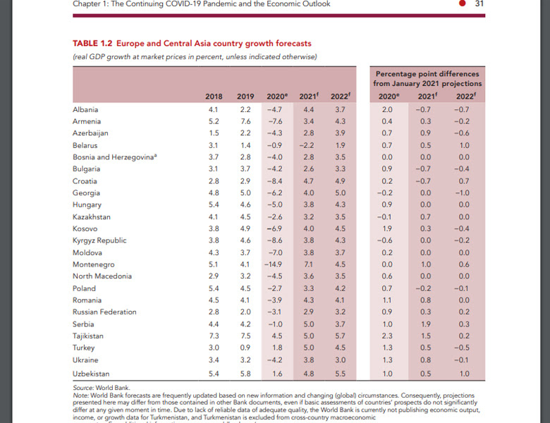 Светската банка посочува дека на стартот на 2021 година економиите на Западен Балкан се едни од најтешко погодените од коронавирусот во Европа и Централна Азија, со најголем број на случаи на новозаболени во еден ден, со што далеку го надминуваат просек на европско-ценралноазискиот регион.