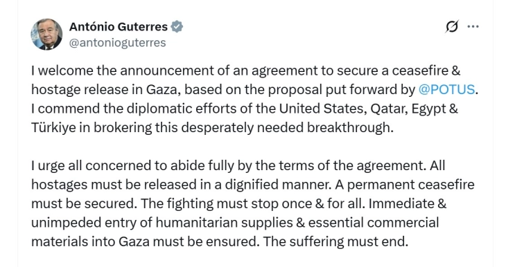 Генералниот секретар на Обединетите нации, Антонио Гутереш, ја поздрави објавата за договорот со кој се предвидува прекин на огнот, ослободување на заложниците и овозможување на хуманитарна помош за Газа.