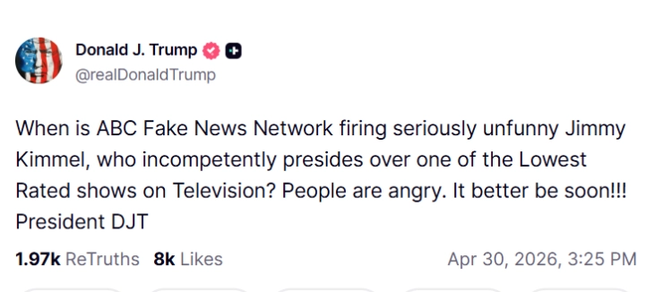 „Кога Еј-Би-Си, таа лажна медиумска мрежа, ќе го отпушти крајно ’незабавниот‘ Џими Кимел, кој неспособно води една од најлошо оценетите емисии на телевизија? Луѓето се бесни. Подобро би било тоа да се случи наскоро“, напиша Трамп на Truth Social.