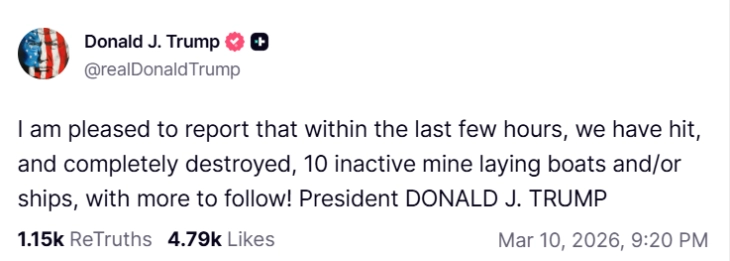 Американските сили погодија 10 ирански бродови кои се обидуваа да постават поморски мини, информира претседателот на САД Доналд Трамп на социјалните мрежи.