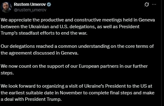 „Нашите делегации постигнаа заеднички договор за основните услови на договорот што беше дискутиран во Женева. Сега сметаме на поддршката од нашите европски партнери во нашите понатамошни чекори“, се вели во соопштението на Умеров. Тој, исто така, изрази оптимизам дека посетата на украинскиот претседател на САД ќе биде организирана во најраниот погоден датум во ноември со цел да се завршат последните чекори и да се постигне договор со Трамп.