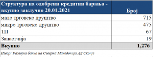 Вкупно досега, од кредитната линија за која се предвидени средства до 31 милиони евра, се одобрени 1.276 кредитни барања на вкупен износ од 14,7 милиони евра, а кои ги исполниле условите од јавниот повик објавен на 7-ми декември 2020 год. Според структурата на досега одобрените кредитни барања, 715 кредитни барања доаѓаат од мали компании, 475 барања се од микро компании, 67 кредитни барања се од трговци-поединци и 19 кредитни барања се од занаетчии.