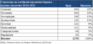 Најголем дел од одобрените 1.276 кредитни барања, доаѓаат од Скопскиот регион, и тоа 32%, а по него следи Полошкиот регион со 16%, Југозападниот регион со 13% и Југоисточниот регион со 11%. Источниот и Пелагонискиот регион доаѓаат следни со 9 отсто од одобрените кредитни барања, додека од Вардарскиот и Североисточниот регион доаѓаат 5% од одобрените кредитни барања.