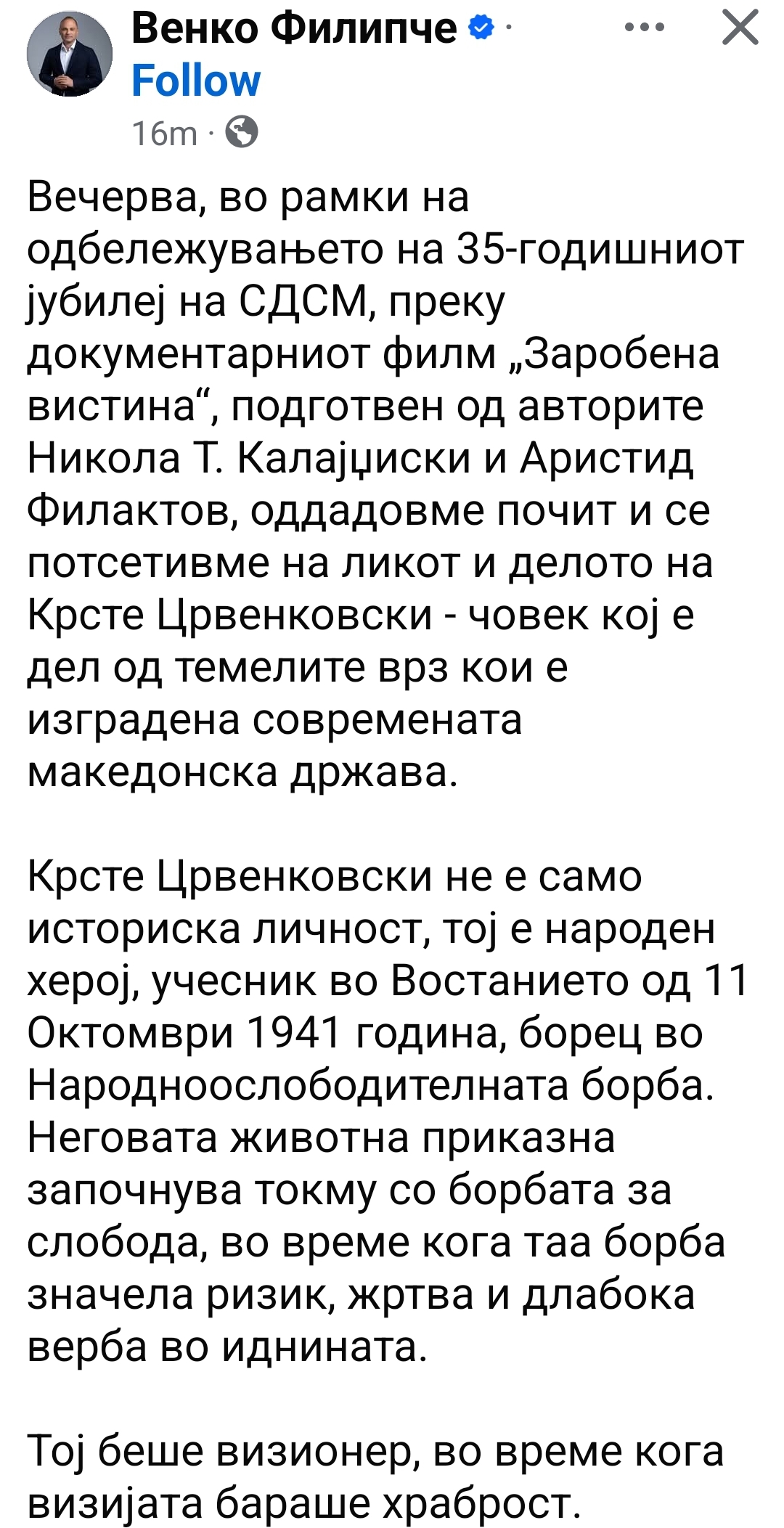 Вечерва, во рамки на одбележувањето на 35-годишниот јубилеј на СДСМ, преку документарниот филм „Заробена вистина“, подготвен од авторите Никола Т. Калајџиски и Аристид Филактов, оддадовме почит и се потсетивме на ликот и делото на Крсте Црвенковски – човек кој е дел од темелите врз кои е изградена современата македонска држава.