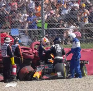 Холанѓанецот беше исфрлен од патеката по судирот со Хамилтон во првиот круг. Британецот доби казна од десет секунди за овој инцидент.