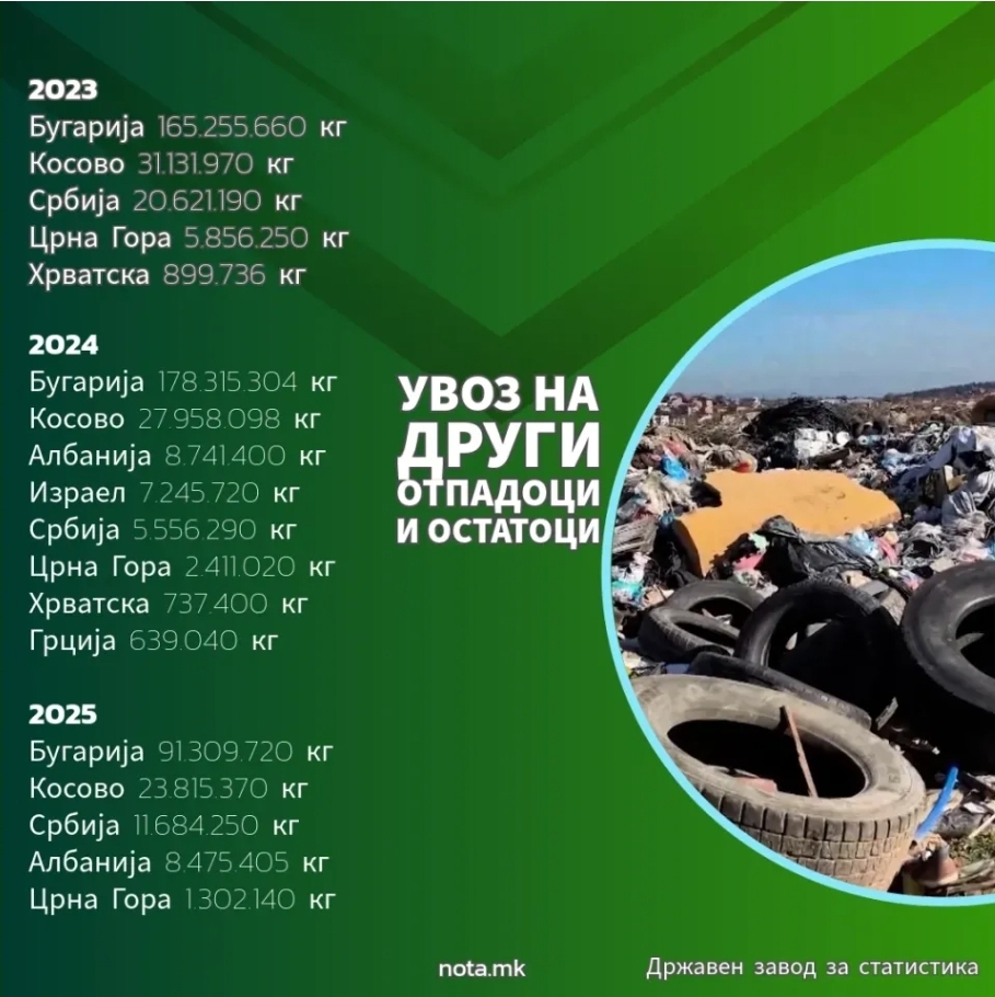 Според македонскиот Државен завод за статистика, во земјата меѓу јануари 2015 и август 2025 година легално се увезени околу 2,2 милијарди килограми отпад. Од тие количини, најмногу отпад е увезен во 2017 година. Пораст се забележува и во последните две години, пишува Нота.
