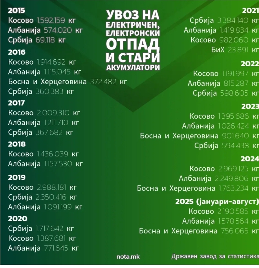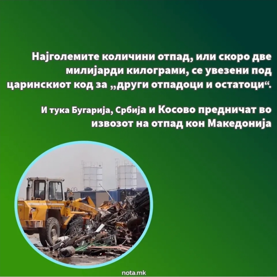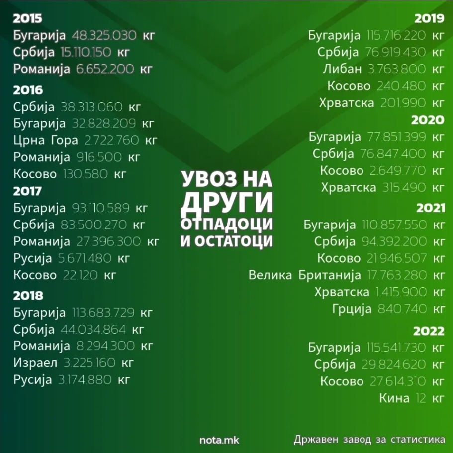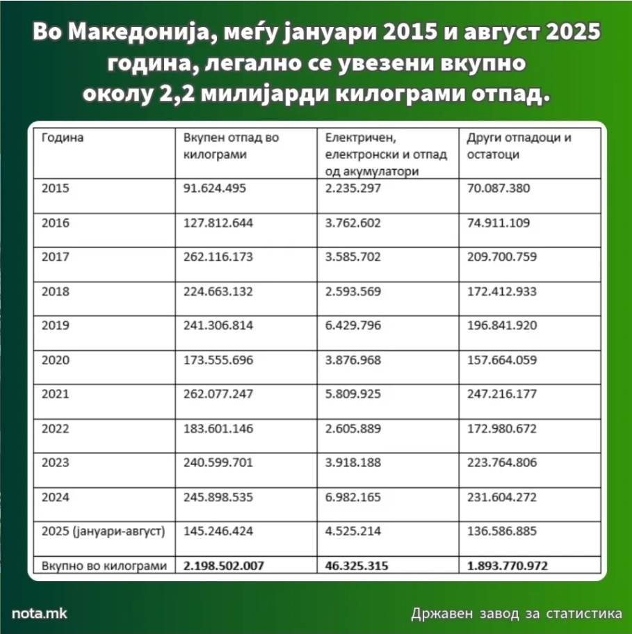 Според македонскиот Државен завод за статистика, во земјата меѓу јануари 2015 и август 2025 година легално се увезени околу 2,2 милијарди килограми отпад. Од тие количини, најмногу отпад е увезен во 2017 година. Пораст се забележува и во последните две години, пишува Нота.