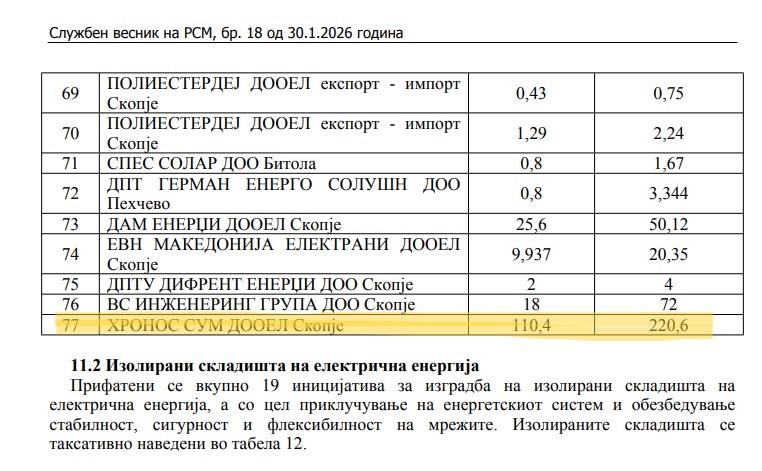Компанијата на Давидовиќ-Дака „Хронос сум” од јануари годинава Божновска ја ставила во Годишниот план за изградба на енергетски објекти за 2026 година, објавен од владата.