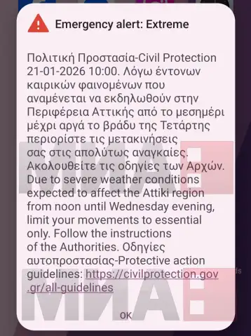 – Поради интензивни временски појави што се очекуваат во периферијата Атика од пладне до доцна навечер во среда, ограничете ги вашите движења само на апсолутно неопходните. Следете ги упатствата на надлежните органи, пишуваше во пораката од бројот 112.