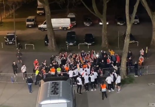 Кога поради полицискиот час, Скопје е мирно и не може македонските навивачи да излезат на славје како што беше во ноември, кога го изборивме историскиот пласман на Европското првенство, иселениците во Германија се собраа пред хотелот да им се поклонат на хероите, од капитенот Горан Пандев, до Елиф Елмас (стрелци на двата гола), Енис Барди, Столе Димитриевски, Стефан Ристовски и останатите.