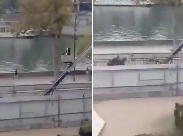 Клипот од 36 секунди, кој е автентично потврден од Le Parisien, прикажува двајца мажи облечени во црно како полека се спуштаат од надворешниот товарен лифт на галеријата Аполо. Едниот од нив носи жолт рефлектирачки елек, а другиот мотоциклистички шлем. Се чини дека видеото е снимено од блискиот прозорец во музејот, со поглед на кејот Франсоа Митеран, каде што крадците претходно паркирале украден камион со скали од 30 метри што ги користеле за да влезат во галеријата на првиот кат.