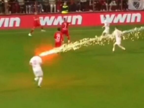 Навивачите на Вележ во второто полувреме испукаа огномет кон теренот и ракетата за малку промаши играч на Зрињски.