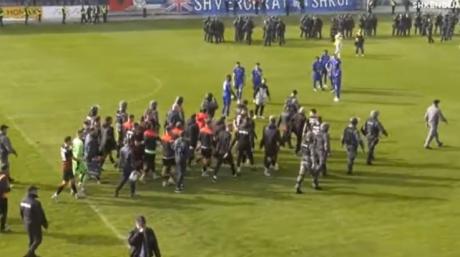 Дел од навивачите влегоа на теренот, а од трибините летаа голем број предмети и пиротехнички материјали.