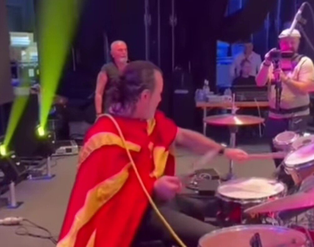 На видеото од настапот тој е обвиен во македонското знаме и свири на ударен инструмент.