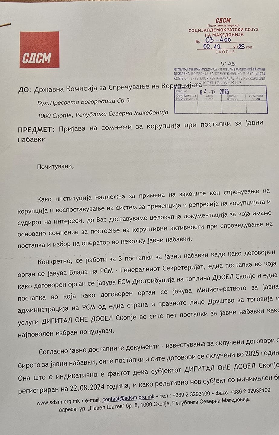 Еве денеска сме пред Државната комисија за спречување корупција, да поднесеме официјална пријава со сите документи, докази и информации што ги објавивме изминативе денови, се вели во изјавата од Петар Огњеновиќ од СДСМ.