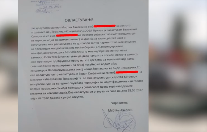 „Во пишаниот документ кој анонимно беше доставен до СДСМ Прилеп Ачкоски нагласил дека факсимилот можат да го користат единствено и само со негова претходна согласност дадена преку социјални мрежи, СМС, вибер, ватс-ап, месинџер или мејл. Напоменувајќи дека овластувањето важи од денот на неговото издавање и се однесува на севкупниот период на неговото отсуство од работа, управителот Мартин Ачкоски зел неплатен одмор и заминал да работи како келнер во едно од туристичките места во Хрватска со амин на директорот на ЈКП Комуналец Рубин Абрашоски“,