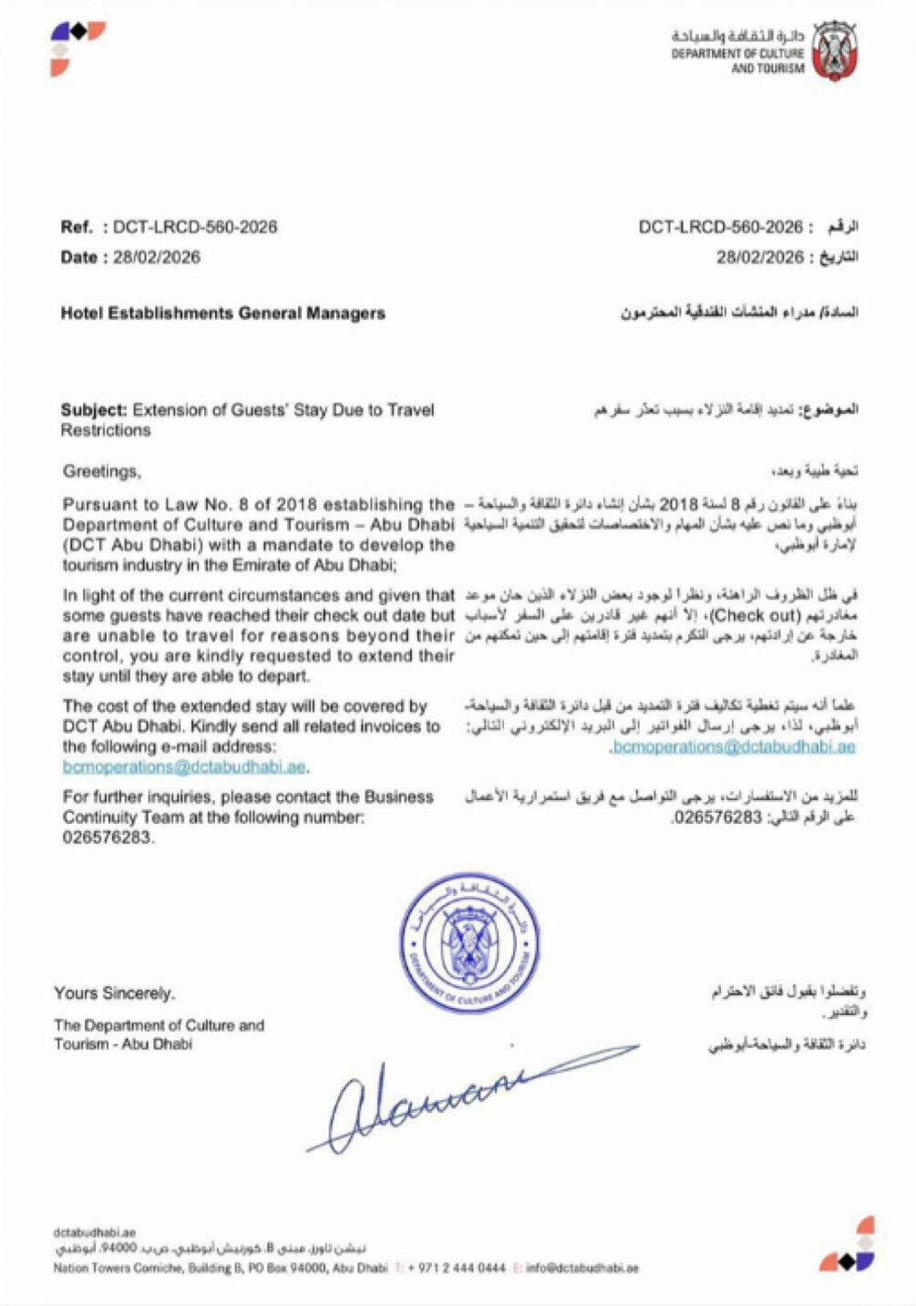 Министерството за култура и туризам нареди на хотелите во Абу Даби да им го продолжат престојот на гостите, бидејќи многумина чиј престој истекува не можат да патуваат во моменталните околности.
