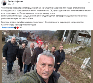 „Честитки за новоизбраниот градоначалник на Општина Маврово и Ростуше, Онер Јакупоски. Благодарност за претседателот на ОК, членовите на ОК, претседателите на месни комитети како и на пратеникот кој безрезервно се вложија за овој успех. Ви посакувам успешен мандат, исполнет со мудри одлуки, одговорно лидерство и посветена работа во интерес на сите граѓани. Верувам дека со визија и искрена посветеност ќе придонесете за развојот, напредокот и благосостојба на Маврово и Ростуше“,напиша Сајкоски на Фејсбук.