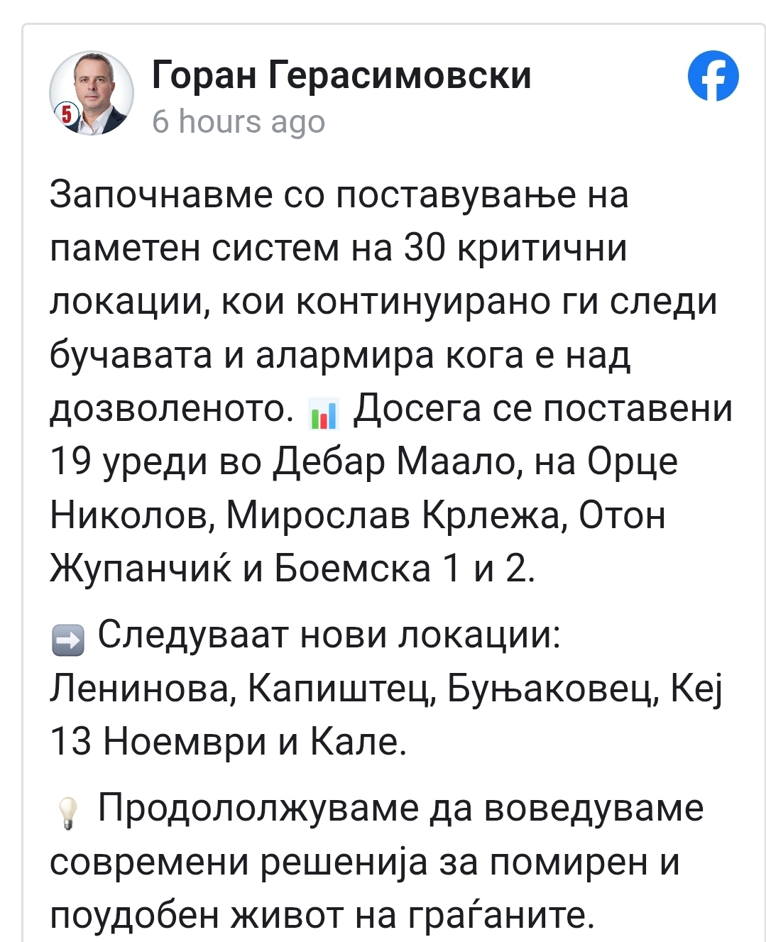 Започнавме со поставување на паметен систем на 30 критични локации, кои континуирано ги следи бучавата и алармира кога е над дозволеното.Досега се поставени 19 уреди во Дебар Маало, на Орце Николов, Мирослав Крлежа, Отон Жупанчиќ и Боемска 1 и 2.
