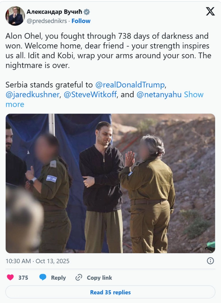 Алон Охел 738 дена се бореше низ темнина и победи. Добредојде дома, драг пријателе, твојата сила нè инспирира сите. Едит и Коби, прегрнете го вашиот син. Кошмарот заврши. Србија е благодарна на Доналд Трамп, Џаред Кушнер, Стив Виткоф и Бенјамин Нетанјаху – лидери кои носат слобода кога е најважна. Стабилноста е единствениот пат напред, напиша Вучиќ на платформата Икс.