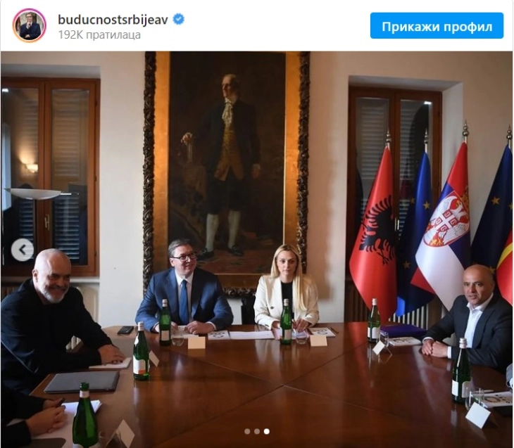 -Имавме плодни дискусии за прашања поврзани со прашањето за Отворениот Балкан. Разговаравме како можеме да ги отстраниме сите пречки, да овозможиме слободна трговија и проток на стоки, услуги и капитал. Разговаравме и за многу други прашања поврзани со безбедноста на храната и како да се обезбеди пристап до други земји. Разговаравме и за електронските картички за сите луѓе за да можат да се усогласат. Таа ситница означува многу голем напредок. Разговаравме и за приемот на нови идентификациони картици и сите тројца се согласивме дека ќе можеме да направиме одреден напредок по тоа прашање во наредните месеци. Се договоривме за завршување на процесот за обезбедување работни дозволи и тоа ќе биде, се осмелувам да кажам, основата на економската соработка меѓу нас, рече Вучиќ.