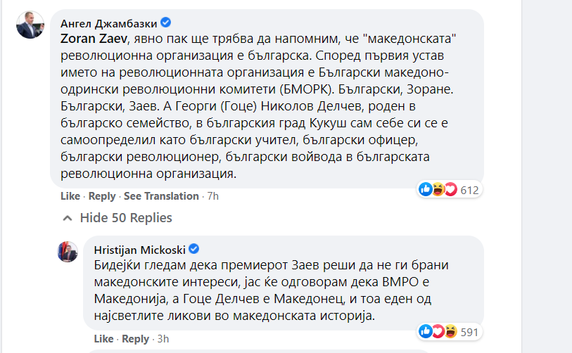 Претседателот на ВМРО-ДПМНЕ, Христијан Мицкоски и бугарскиот европратеник Ангел Џамбаски се препукуваа во коментари на објавата на премиерот Зоран Заев за тоа чиј е Гоце Делчев.