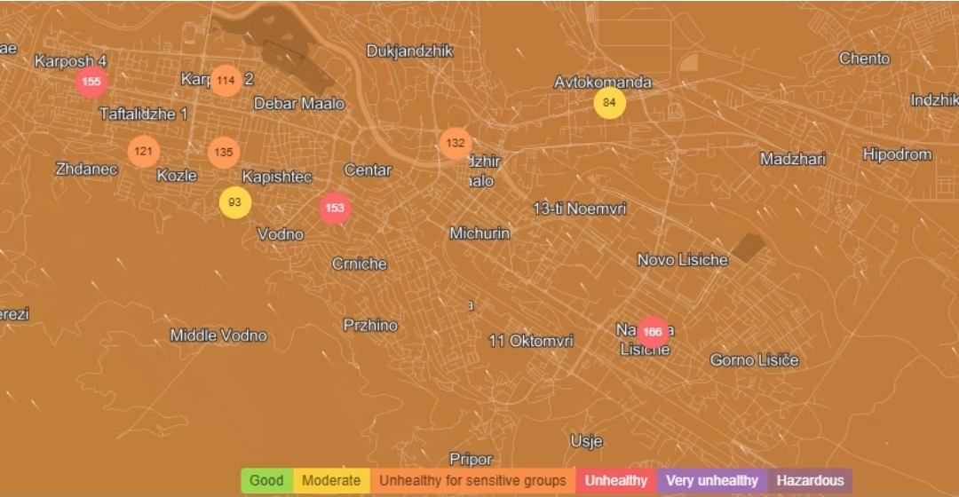 Според последните мерења, Ново Лисиче е најкритично со индекс на квалитет на воздухот (AQI) 166, што се категоризира како „нездраво“. Следуваат: