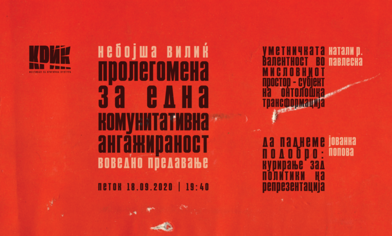 По проекција на филмот следува предавањето на Небојша Вилиќ насловено „Пролегомена за една комунитативна ангажираност“, проследено со излагања на Натали Р. Павлеска и Јованка Попопова и разговор помеѓу тројцата учесници.